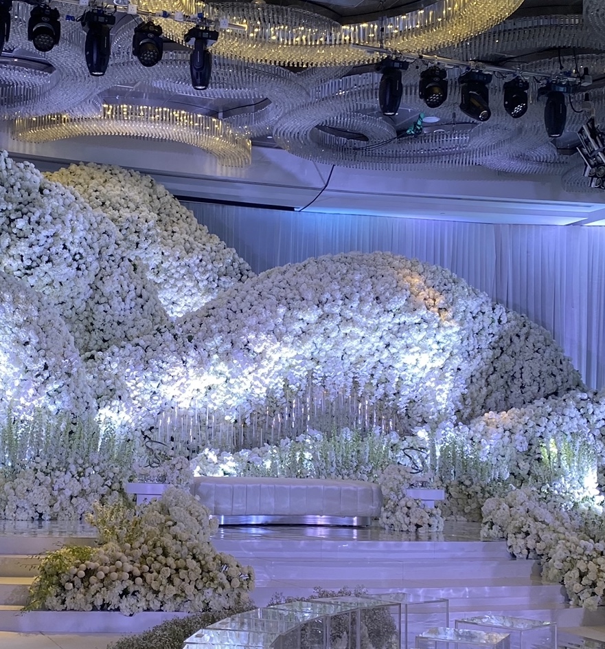 Neelofa menggunakan khidmat pereka majlis terkenal, Reka Teemor yang menggunakan bungaan putih untuk menghiasi pelamin serta dewan bak di kayangan. Laluan menuju ke pintu dewan turut diserikan dengan hiasan bunga.