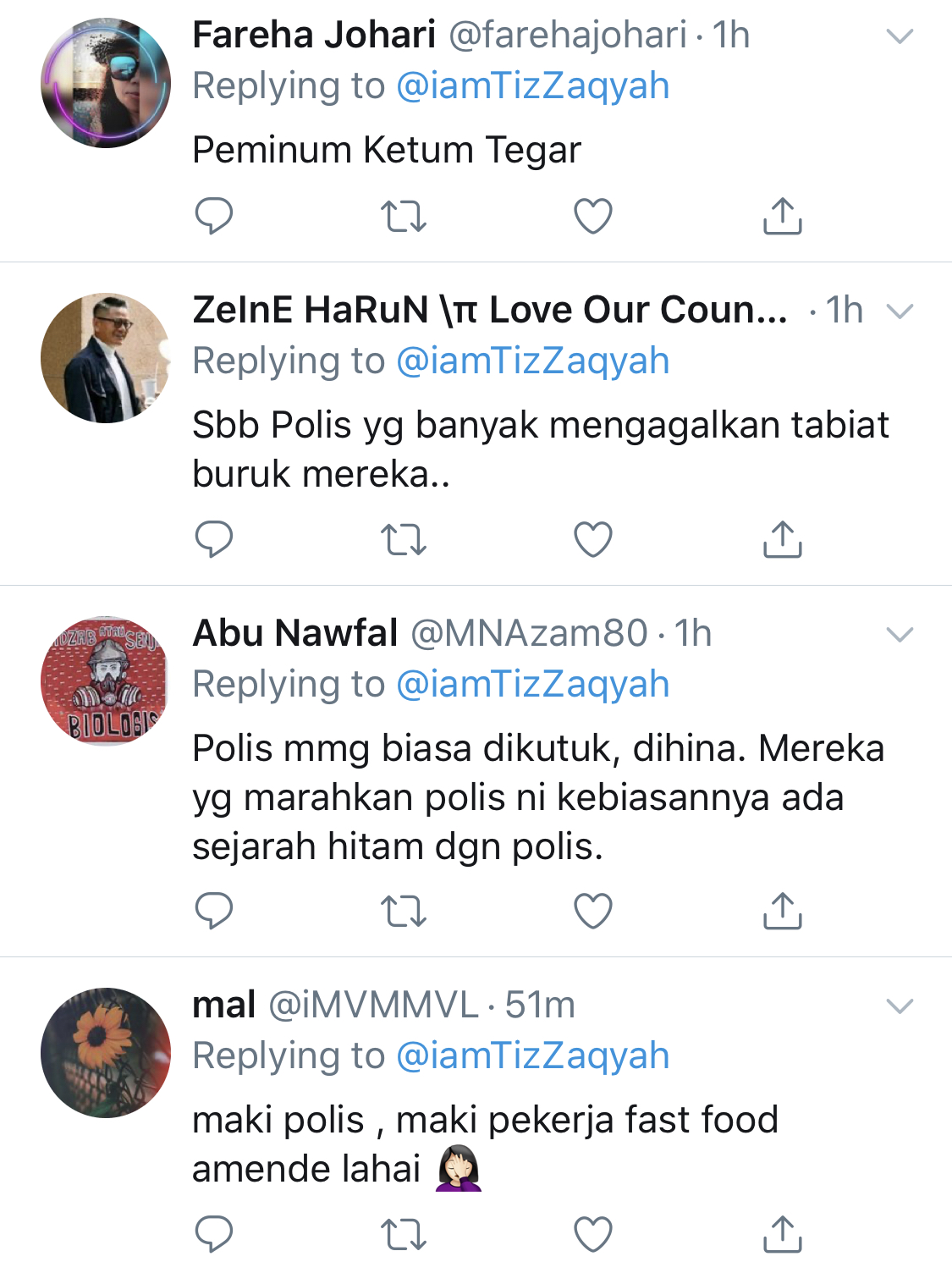 Menurut Tizz lagi, dia tidak faham mengapa masih ada segelintir pihak yang mengganggu urusan polis sehingga ada yang berani meninggikan suara serta memaki hamun.