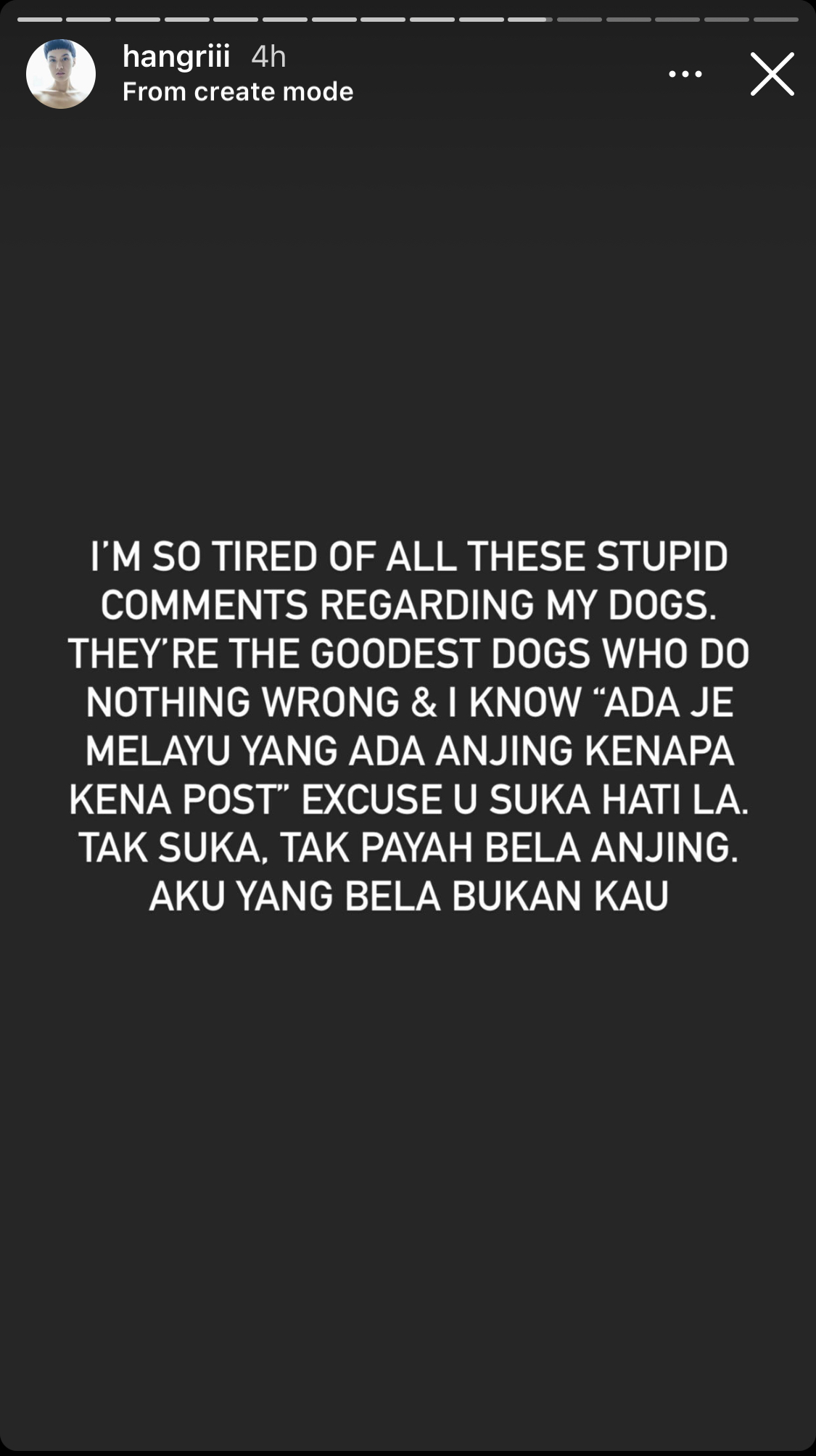 “I’m so tired of all these stupid comments regarding my dogs. They’re the goodest dogs who do nothing wrong and I know ‘ada je melayu yang ada anjing kenapa kena post’.