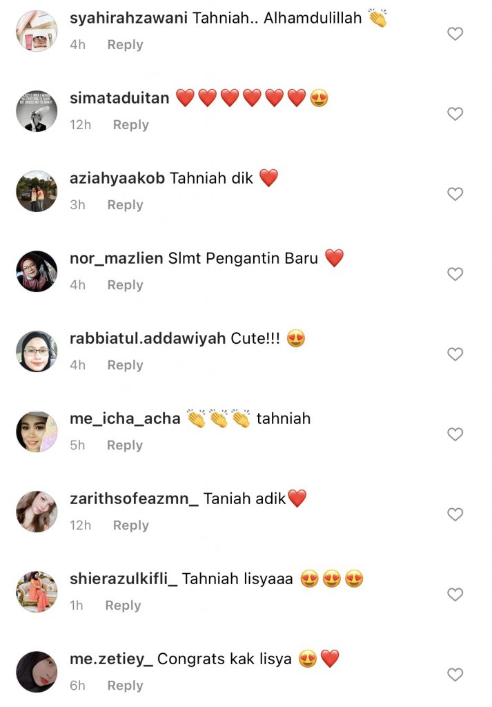 Lantas, rata-rata rakan selebriti serta peminat telah menitipkan ucapan tahniah dan mendoakan mahligai cinta pasangan ini berkekalan hingga ke akhir hayat.