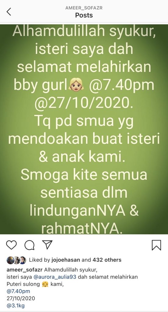 “Terima kasih pada seluruh family, saudara, sahabat, kawan², peminat² & semua yg mengenali kami kerana mendoakan buat isteri & anak kami. Smoga kite semua sentiasa dlm lindunganNYA & rahmatNYA.