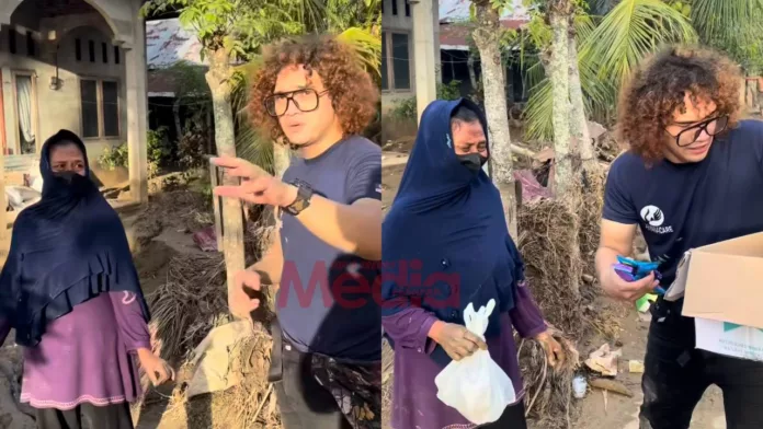 Pelakon dan aktivis kemanusiaan, Nadzmi Adhwa tidak dapat menahan sebak ketika menghulurkan bantuan kepada seorang wanita yang juga antara mangsa terkesan akibat musibah banjir besar di Aceh, Indonesia.