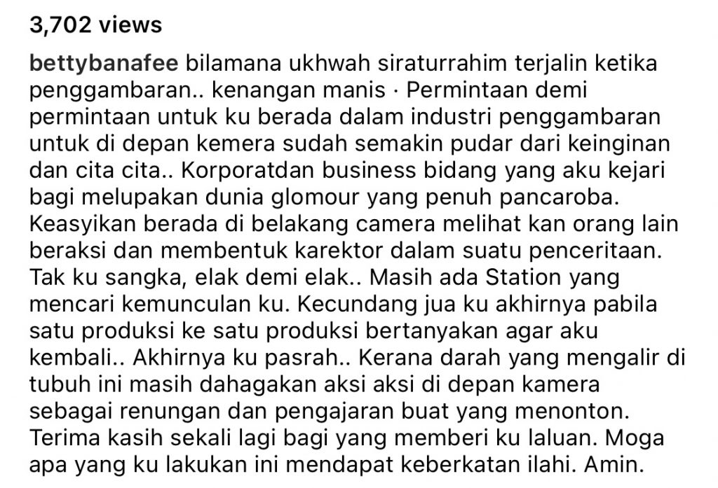 Pelakon, Betty Banafe meluahkan rasa syukur kerana masih diberikan peluang untuk beraksi dan kembali ke dunia industri hiburan tanah air.