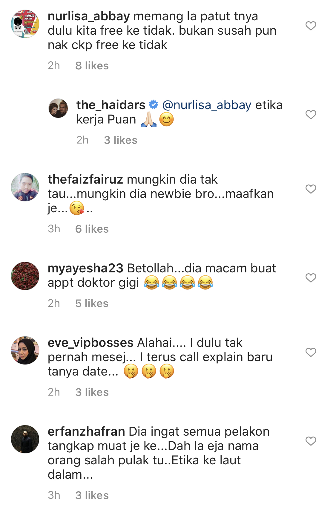 “Biar pelakon itu sendiri bertanyakan date tersebut. Maaf sekali lagi saya terpaksa reject tawaran anda sebelum saya ambil tahu tentangnya,” tulisnya.