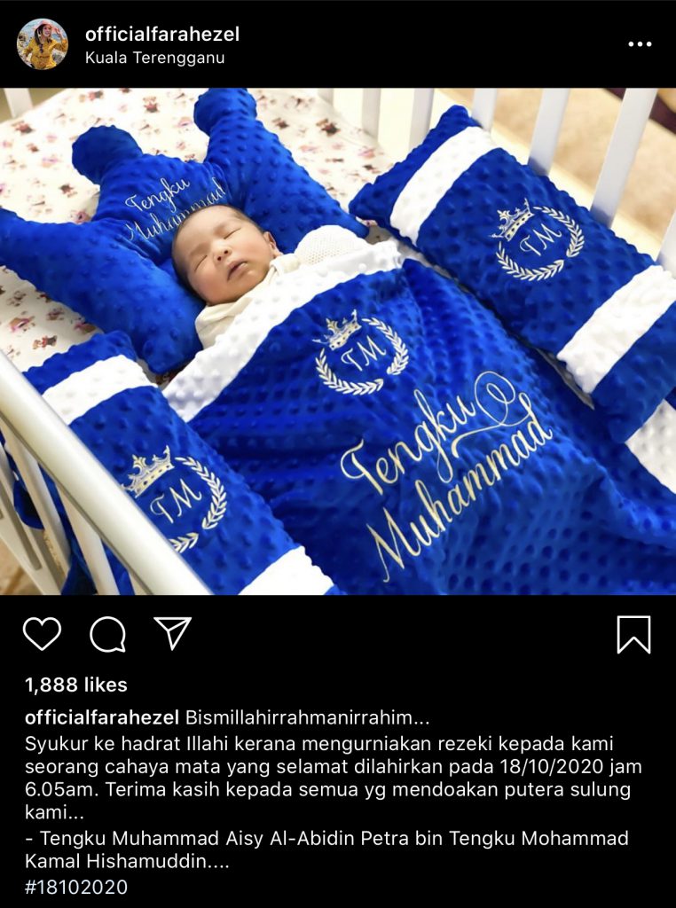“Terima kasih kepada semua yg mendoakan putera sulung kami, Tengku Muhammad Aisy Al-Abidin Petra bin Tengku Mohammad Kamal Hishamuddin,” titipnya.