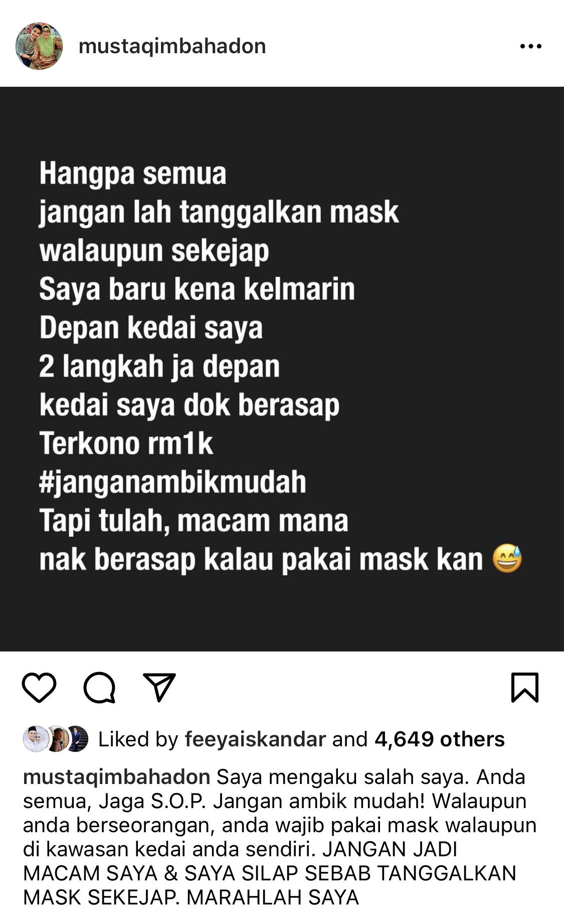 Pelakon dan usahawan, Mustaqim Bahadon akur dengan kesilapannya selepas dikompaun pihak berkuasa gara-gara menanggalkan topeng pelitup muka di tempat awam.