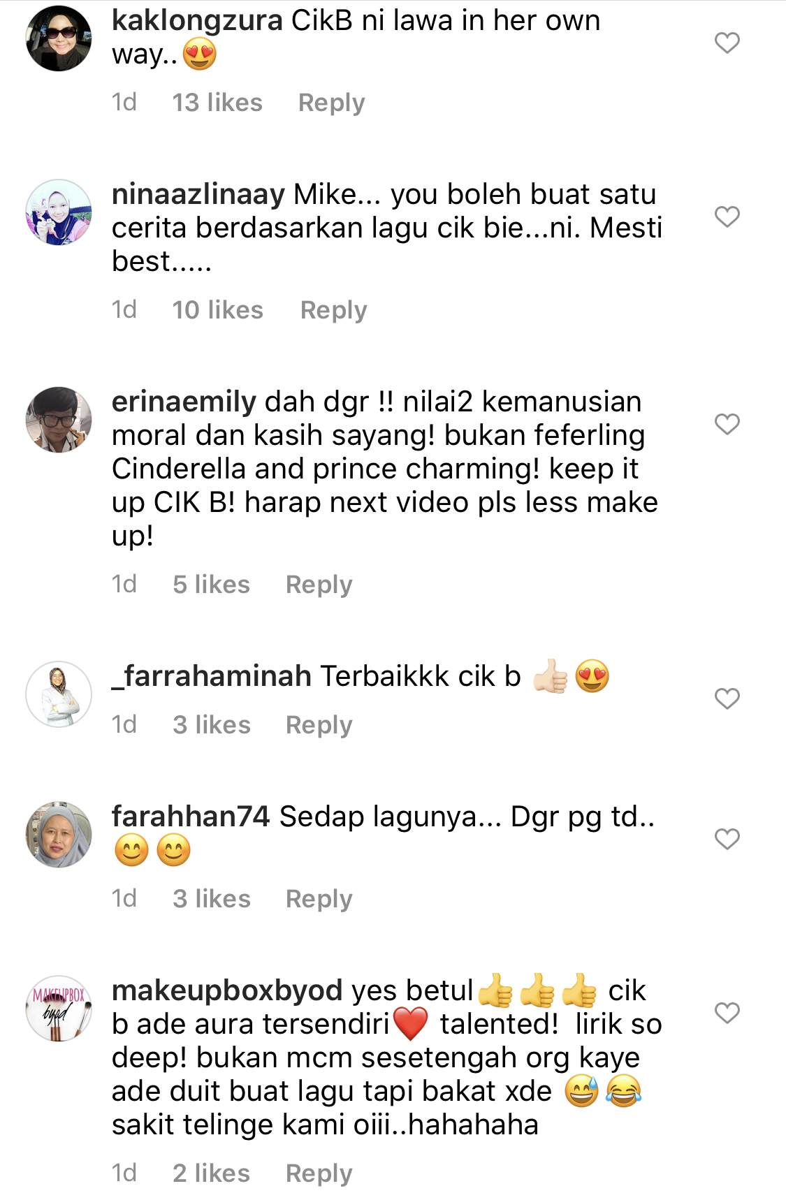“I wish you all the best and yang belum dengar pergi la dengar and suara Cik B is unique and ada value dia sendiri and bukan buat lagu untuk gimmick macam @datoserivida hehe.