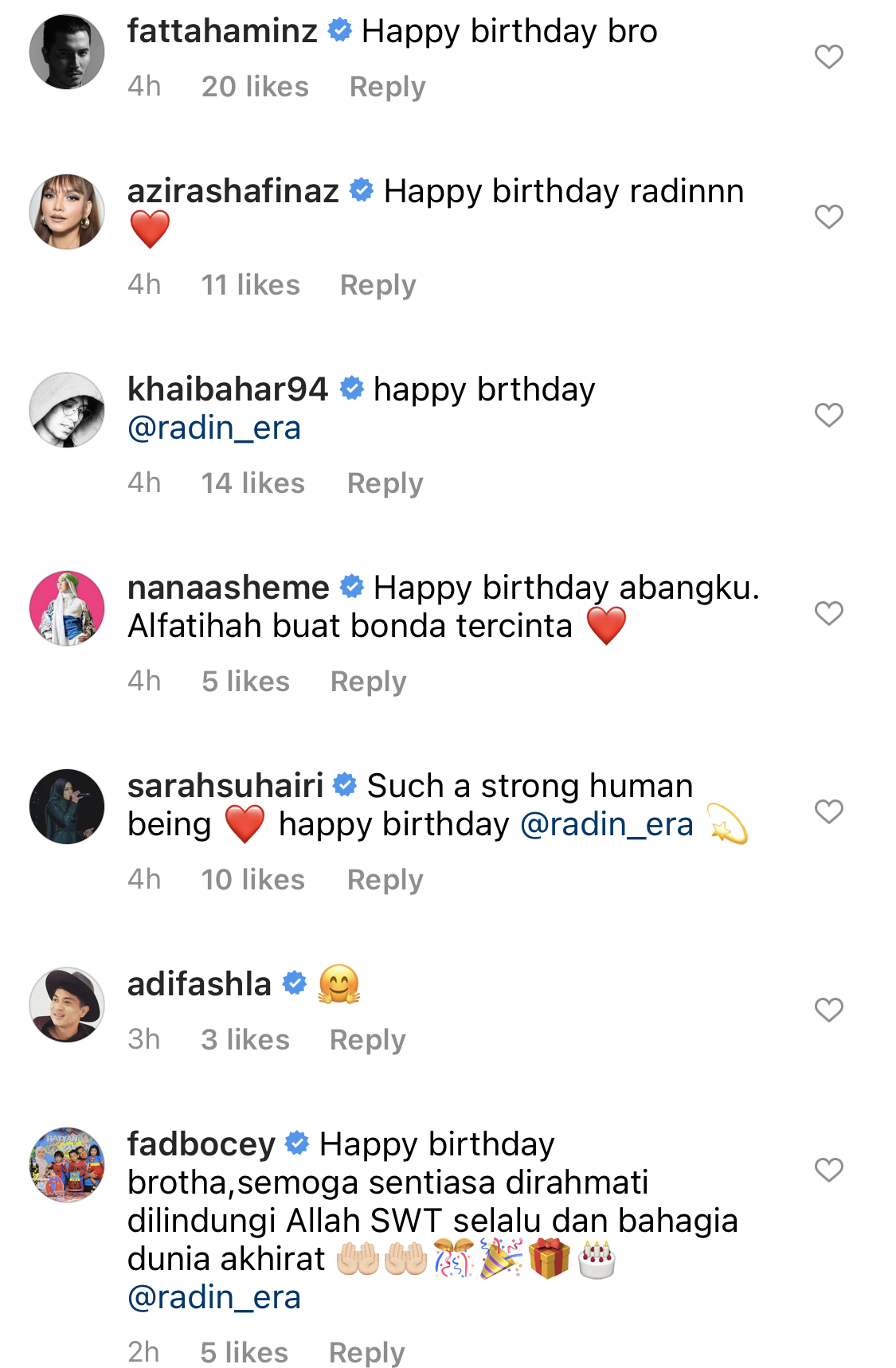 Malah, Radin juga berterima kasih kepada semua pihak yang telah menitipkan ucapan hari lahir buat dirinya.