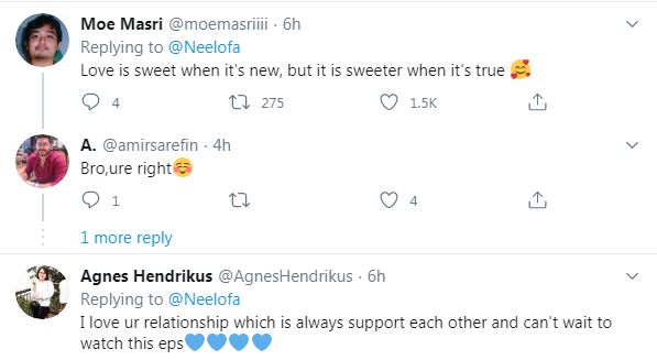 “Saya pernah kongsikan sebelum ini, si dia selalu menyokong dan saya gembira. Dia sangat-sangat membantu misalnya dalam memberikan nasihat. Begitu juga dalam kerjaya seni.
