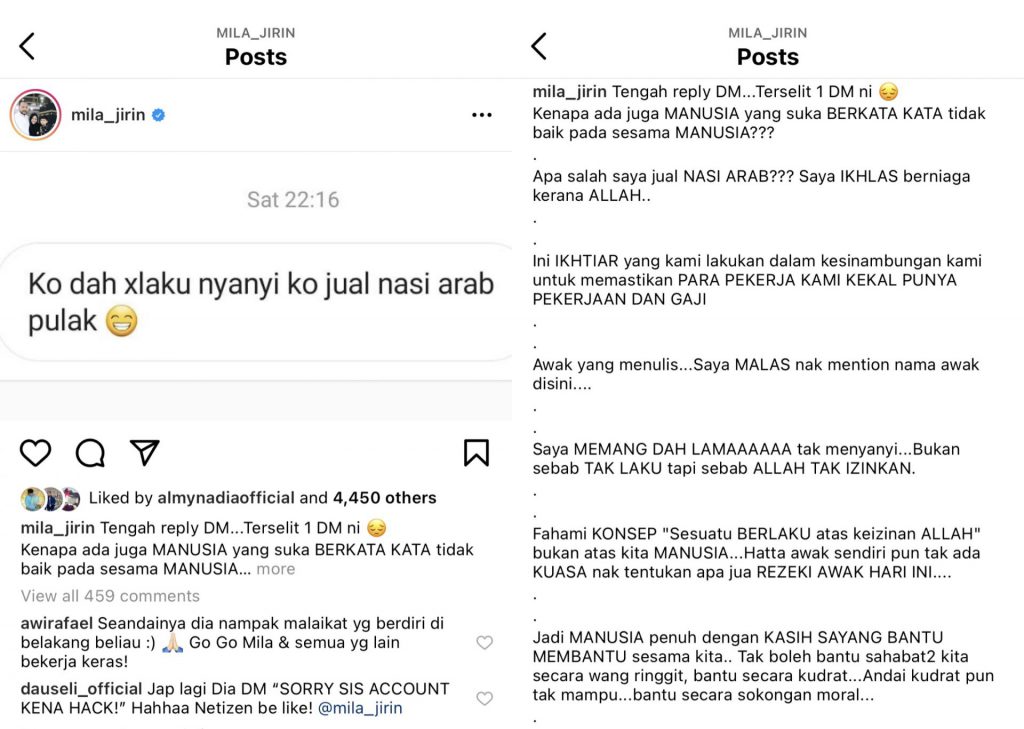 Dalam tangkap layar dimuat naik, individu berkenaan menempelaknya dengan mengatakan Mila berniaga Nasi Arab selepas kerjaya nyanyiannya tidak menjadi.