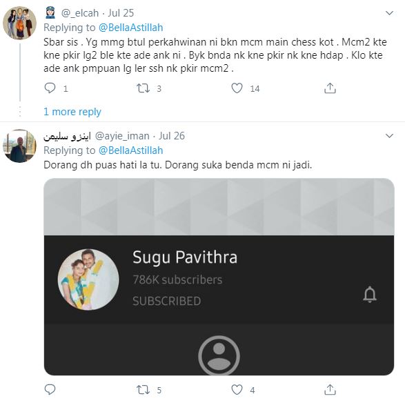 Penyanyi dan pelakon, Bella Astillah meluahkan rasa selepas ramai pihak yang menganggap situasi yang dihadapi Youtubers sensasi, S.Pavithra dan M.Sugu adalah sama dengan apa yang dilaluinya bersama suami, Aliff Aziz.