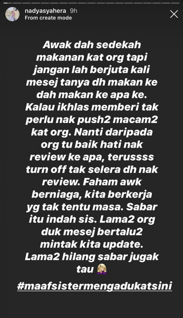 “Lama-lama hilang sabar juga tau,” tulisnya menerusi hantaran di IG Stoeries sambil disusuli dengan tanda palang #maafsistermengadukatsini