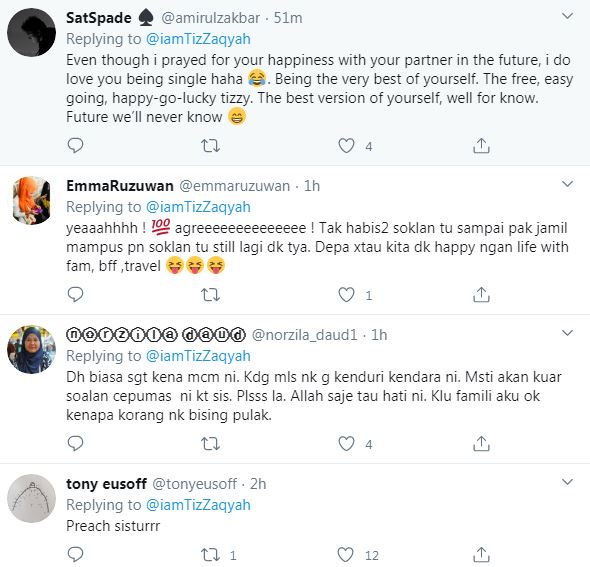 Tambah Tiz lagi, sebagai orang yang telah berkahwin, mereka sepatutnya tidak perlu berasa iri hati dengan kehidupan orang bujang masa kini.