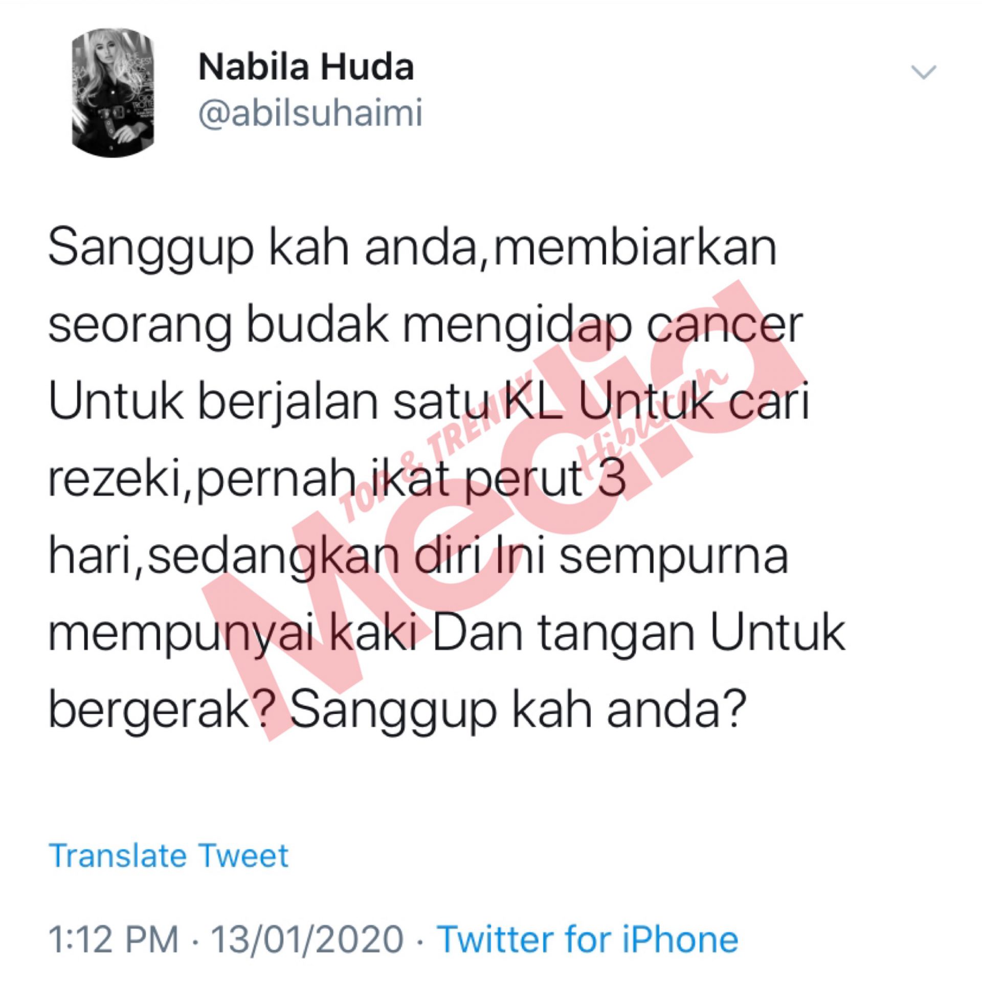 Meluahkan pandangan di laman Twitter, pelakon Nabila Huda mempersoal mengapa seorang remaja yang mengidap penyakit kronik dibiarkan berjalan kaki di ibu kota untuk menyara hidup.
