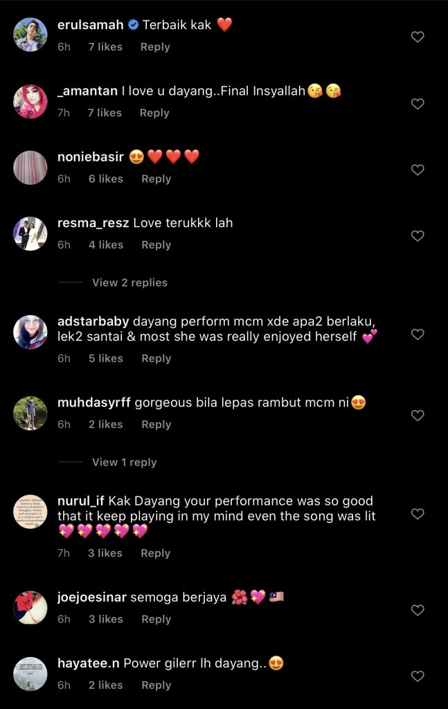 Lalu menerusi ruangan komen pada posting tersebut, para peminat dan rakan selebriti memberi reaksi baik terhadap persembahan bertenaga dari penyanyi berkenaan.