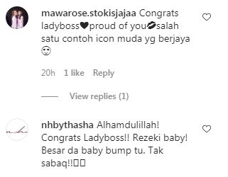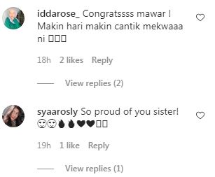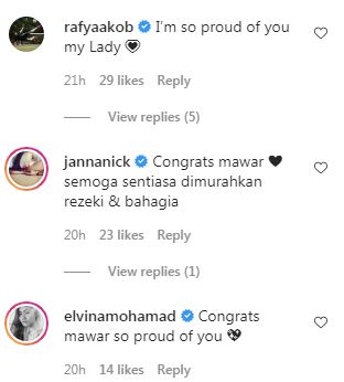 Menerusi ruangan komen, rata-rata pengikut dan rakan artis menitipkan ucapan tahniah selain turut mendoakan semoga Mawar terus berjaya pada masa akan datang.