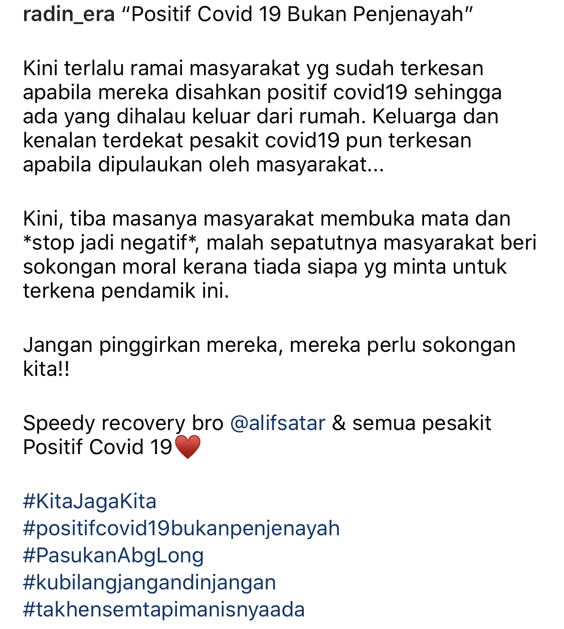 “Jangan lupa doakan kesembuhan buat kami dan semua yang sedang berlawan dengan covid,” akhirinya.