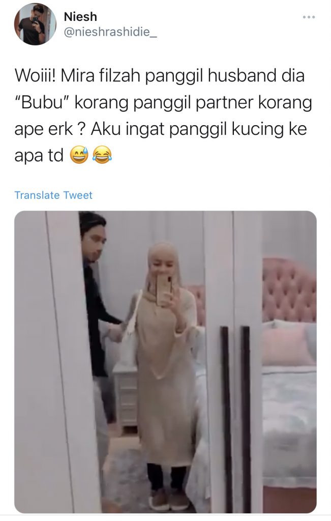 “Woiii! Mira filzah panggil husband dia “Bubu” korang panggil partner korang ape erk ? Aku ingat panggil kucing ke apa td,” tulisnya seorang pengguna media sosial Twitter.