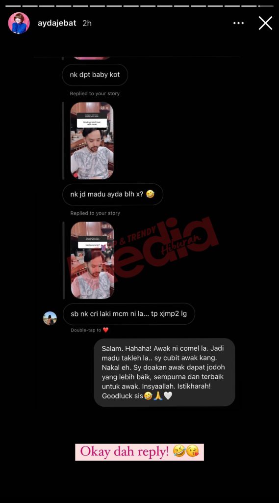 “Saya doakan awak dapat jodoh yang lebih baik, sempurna dan terbaik untuk awak. Insya-Allah, istikarah! Good luck sis,” respon Ayda.