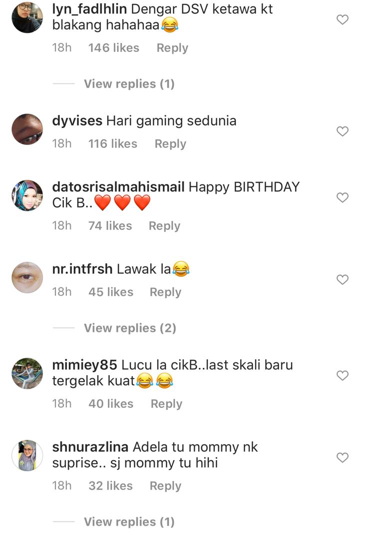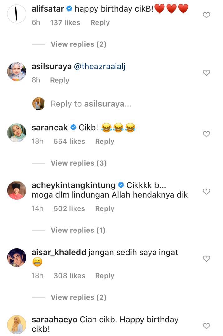 Menerusi ruangan komen, rata-rata netizen dan selebriti tempatan ada menitipkan ucapan hari lahir buat Cik B selain turut memintanya supaya jangan bersedih kerana masih ramai lagi orang yang menyayangi dirinya di luar sana.