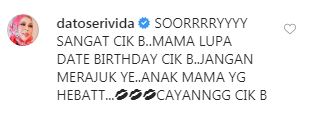 “Jangan merajuk ye. Anak mama yang hebat. Cayanngg Cik B,” tulisnya.