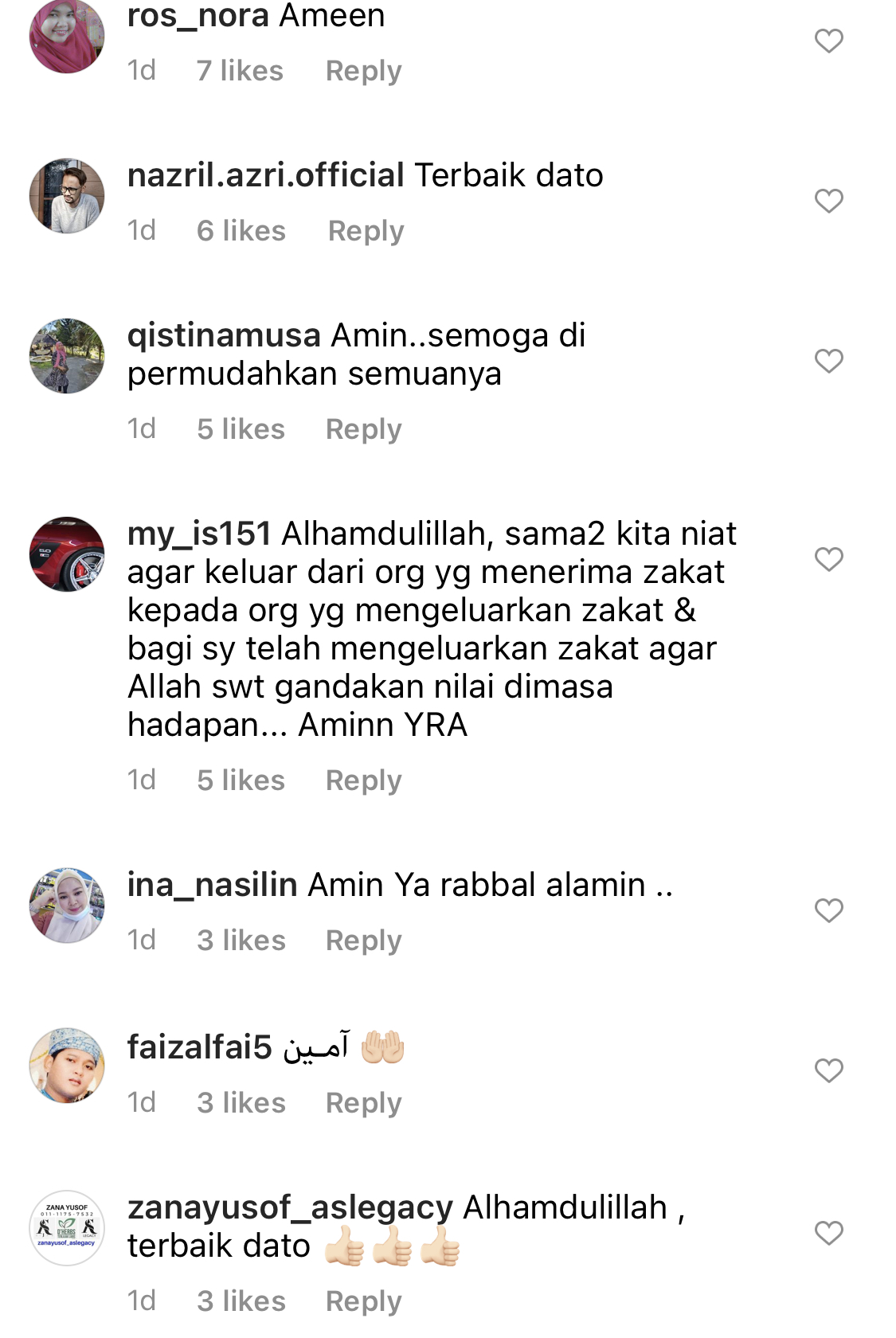 “Semoga dengan zakat yg disalurkan di @zakatselangor ini boleh dapat meringankan beban untuk mereka yg kirang bernasib baik… apa yang saya minta hanyalah sekadar Doa. AMIN AMIN YA RAB,” katanya lagi.