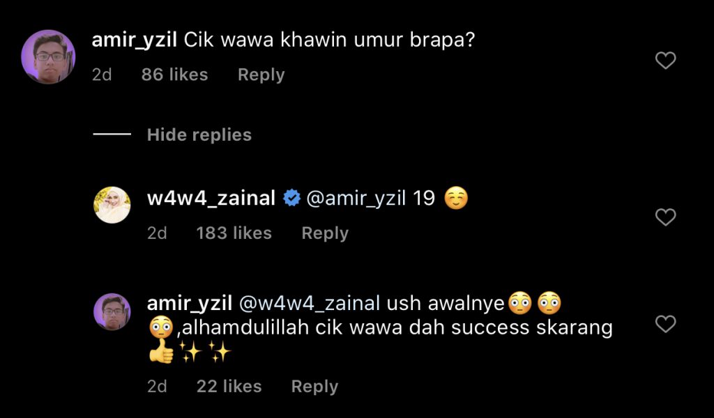 Malah, ada beberapa komen yang diberikan mendapat reaksi balas daripada Wawa, misalnya ketika ditanya berapa usianya saat berumah tangga.