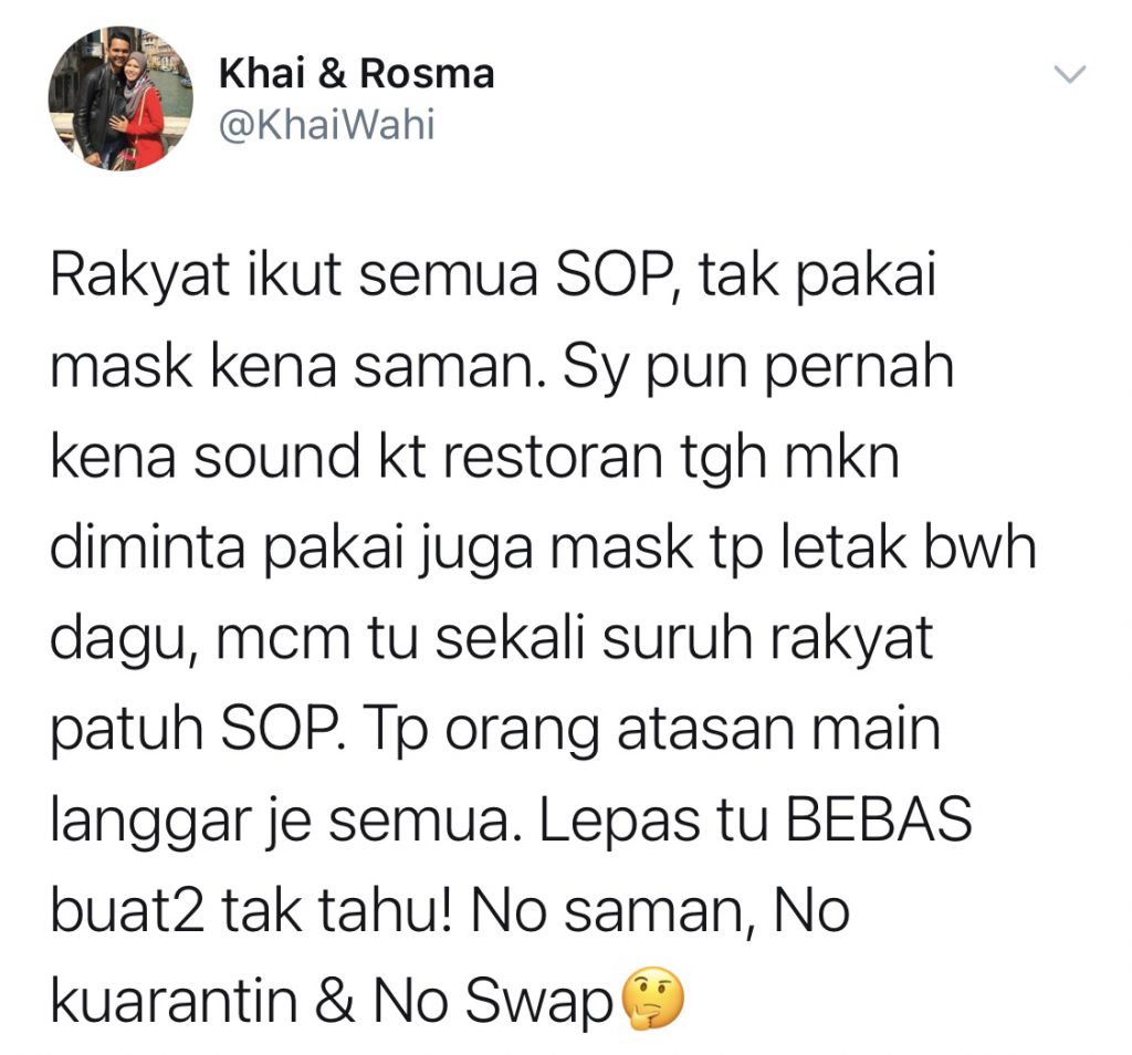 “Tp orang atasan main langgar je semua. Lepas tu BEBAS buat2 tak tahu! No saman, No kuarantin & No Swap,” tulisnya.