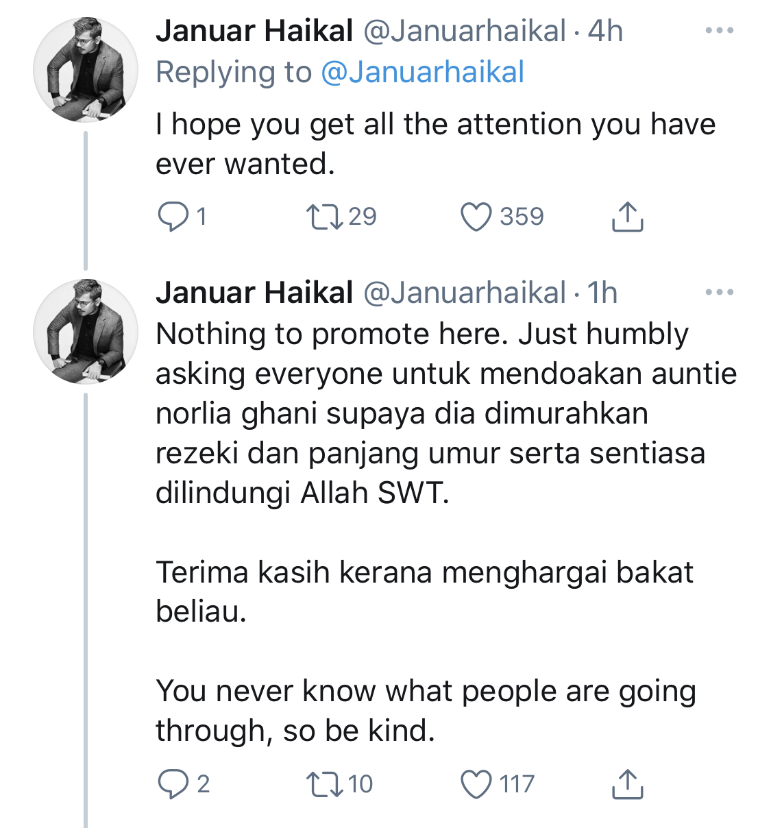 “Nothing to promote here. Just humbly asking everyone untuk mendoakan auntie norlia ghani supaya dia dimurahkan rezeki dan panjang umur serta sentiasa dilindungi Allah SWT.