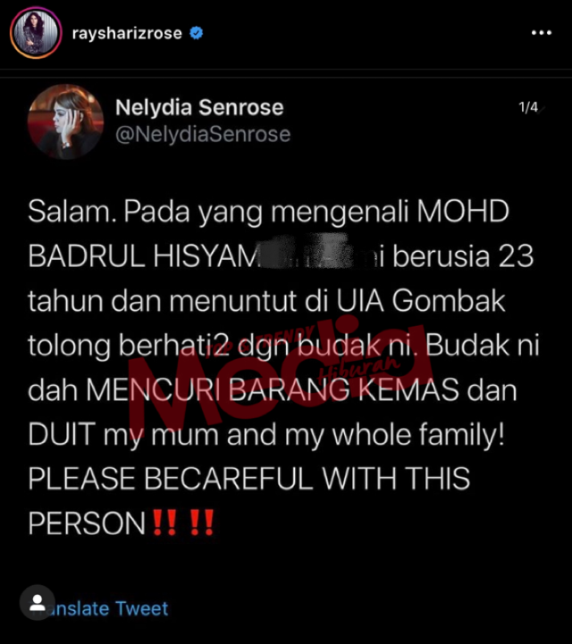 Dalam pada itu, Raysha turut memuat naik beberapa keping foto terkait di platform sama, termasuk satu Twit dari kakaknya, Nelydia Senrose berhubung perkara sama.