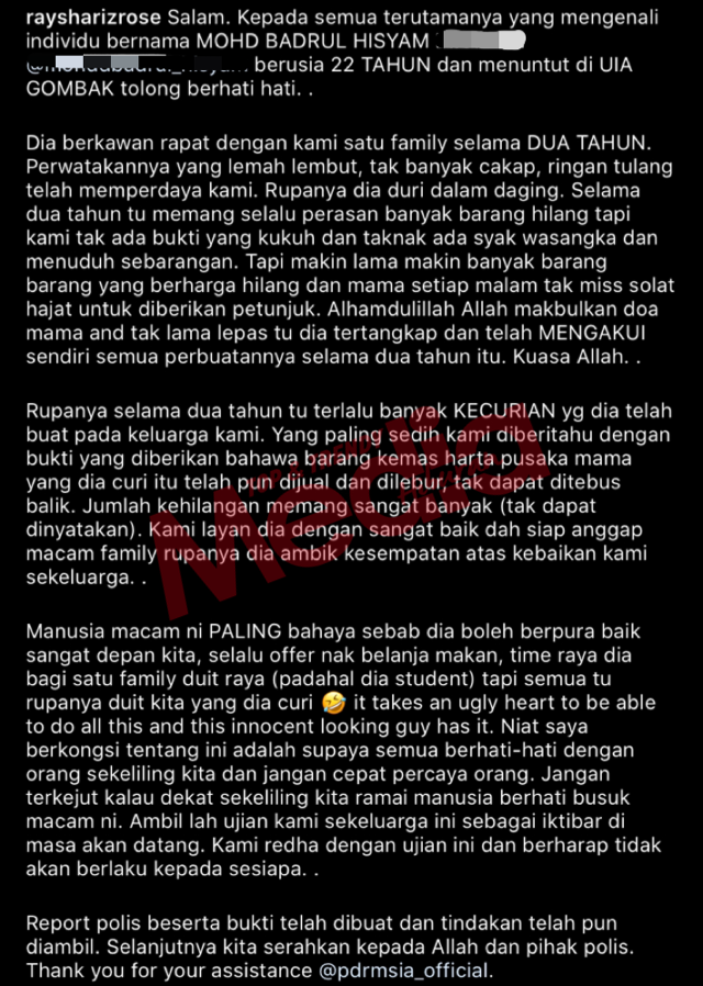 Report polis beserta bukti telah dibuat dan tindakan telah pun diambil. Selanjutnya kita serahkan kepada Allah dan pihak polis,” tulis Raysha panjang lebar sambil turut memberi kredit kepada pihak berkuasa.