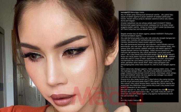 Menerusi satu hantaran di Instagramnya @nursajat yang kini dalam mood privasi, Sajat ada berkongsi kekeliruannya di dalam melakukan amal kerana status diri selain mendedahkan dia kini mejalani rutin sebagai wanita meski dalam id (kad pengenalannya) ialah lelaki.