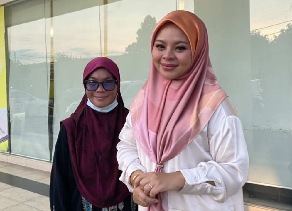 Penyanyi Alina Hassan, 52, tidak dapat menahan sebak selepas bertemu dengan penyanyi, Siti Sarah yang bermurah hati cuba memulihkan masalah penglihatan mata kanannya yang tidak dapat digunakan kerana selaput mata atau katarak di Prof Muhaya Eye & LASIK Centre, pada Khamis.