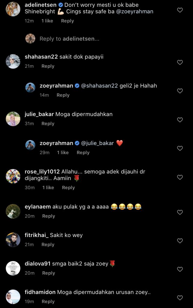 Sehubungan dengan perkongsian yang dibuat Zoey, para peminat dan rakan artis sama-sama berdoa agar semuanya selamat dan dipermudahkan.