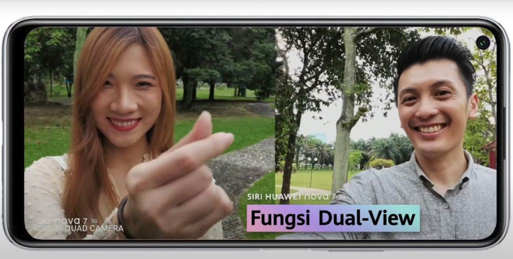 Siri HUAWEI nova 7 menyokong mod rakaman Dual-View yang mana kamera hadapan dan belakangnya mampu mengambil video pada waktu sama. Menarik bukan?