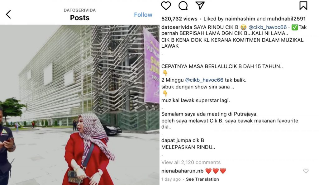 “boleh saya melawat Cik B. saya bawak makanan favourite dia. Dapat jumpa cik B MELEPASKAN RINDU..,” tulis Vida.