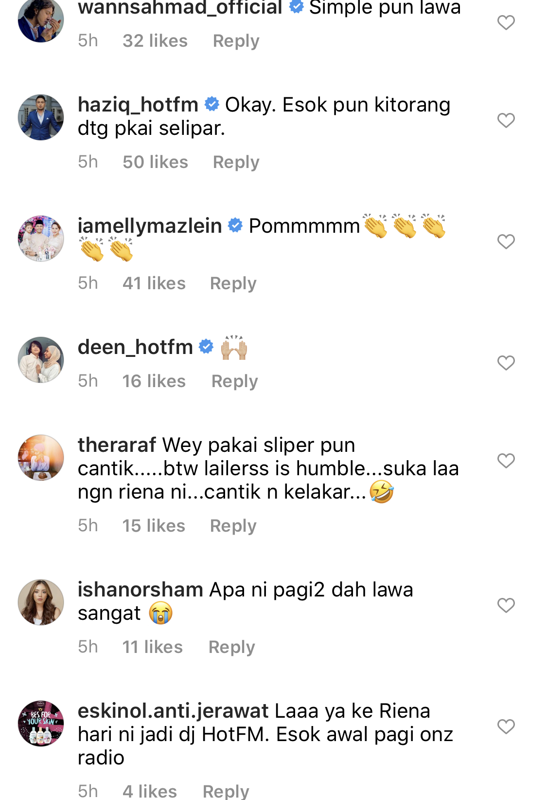 “Surprise from Lailerrr! Hahaha @rienadiana_ nak caras job @deen_hotfm & @haziq_hotfm minggu ni. So guys, jangan lupa dengarkan Deen, Haziq & Riena on air sepanjang minggu ni dari 6 pagi hingga 10 pagi! Hot FM, Lebih Hangat Daripada Biasa,” tulisnya pengendali akaun tersebut.