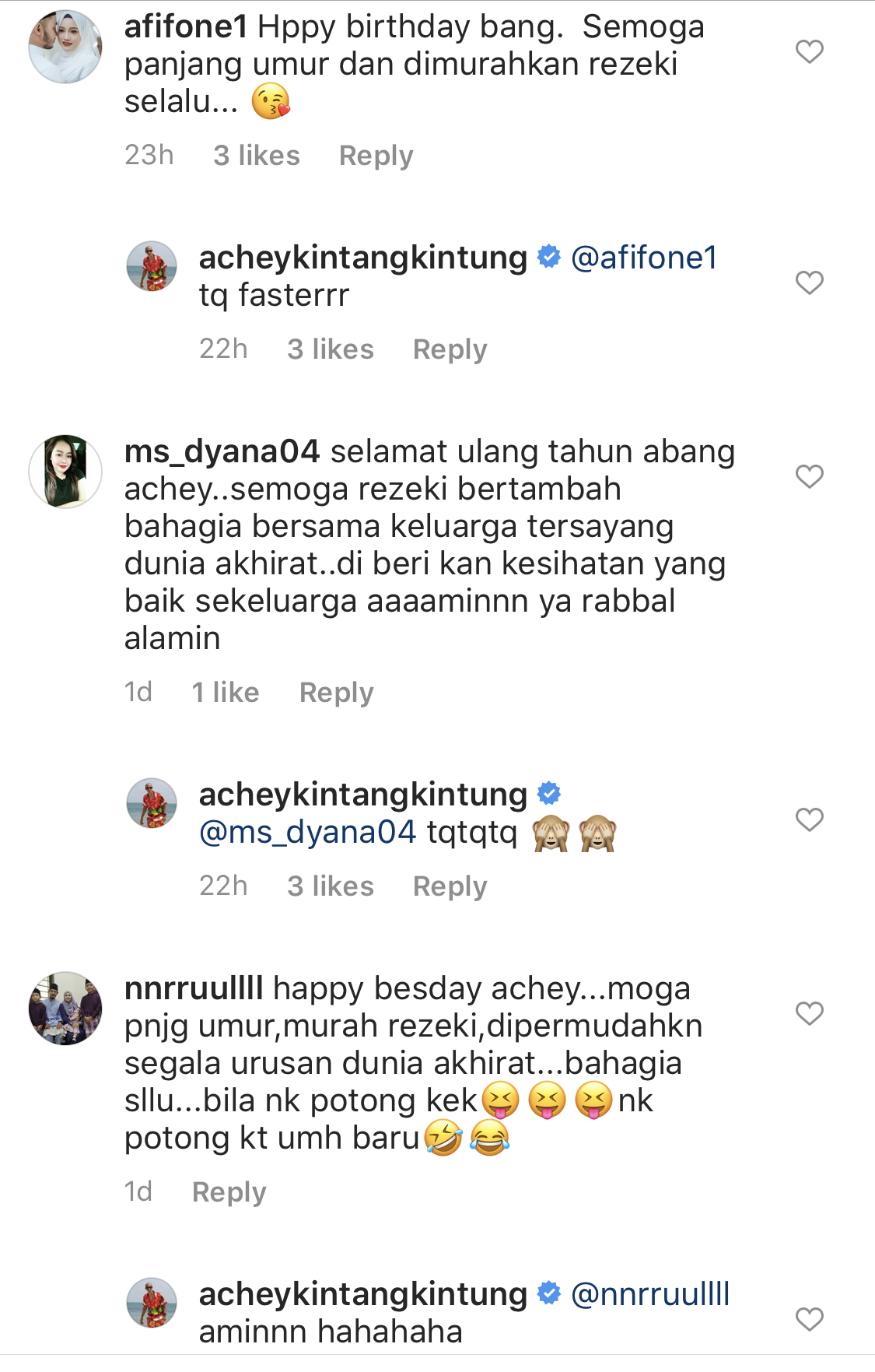 “Assalamualaikum Abang Achey, selamat hari jadi. Semoga panjang umur dan dimurahkan rezeki selalu.