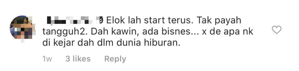 “Elok lah start terus. Tak payah tangguh2. Dah kawin, ada bisnes… x de apa nk di kejar dah dlm dunia hiburan,” tulis individu tersebut.