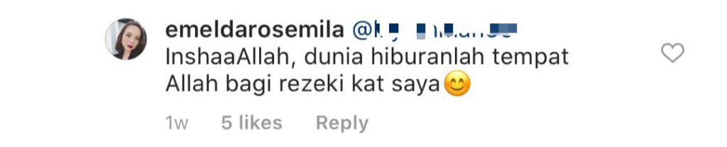 “InshaaAllah, dunia hiburanlah tempat Allah bagi rezeki kat saya,” balas Emelda.