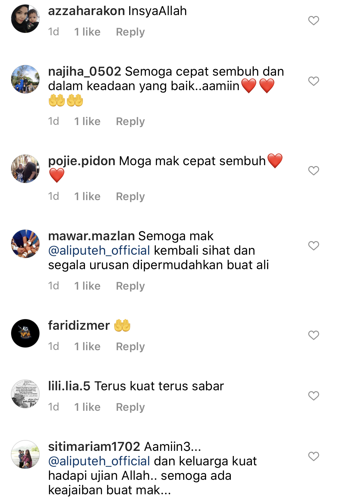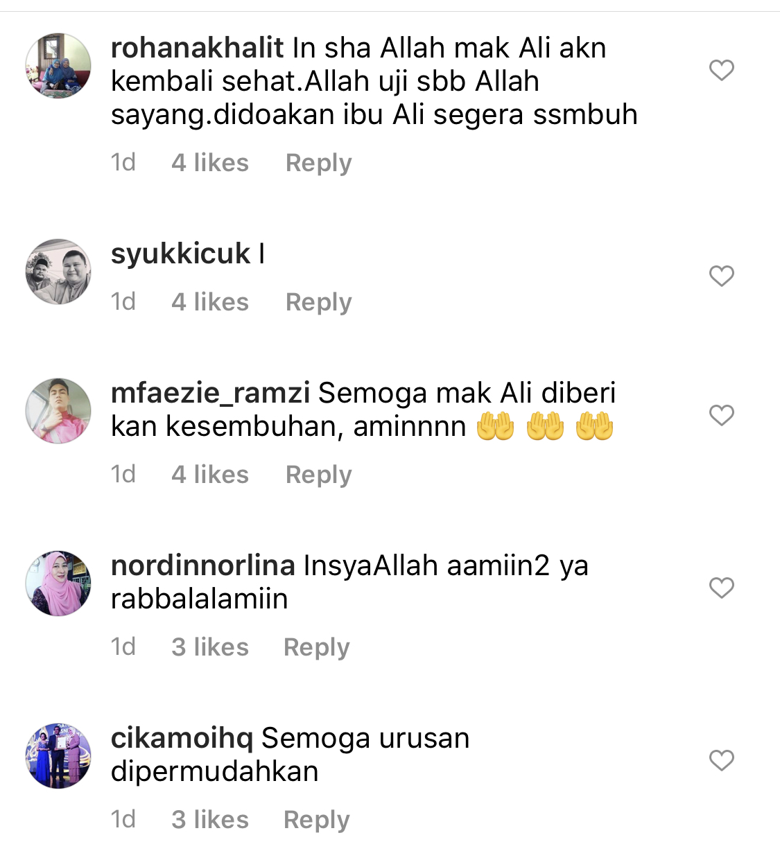 Menerusi ruangan komen, rata-rata netizen memberikan kata-kata semangat selain turut mendoakan semoga ibunya itu dapat segera pulih.