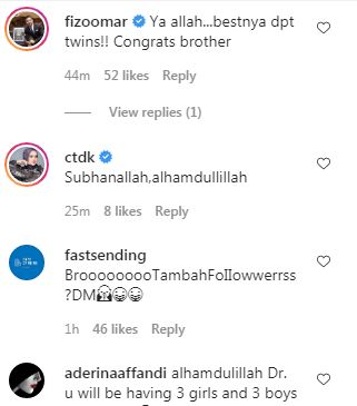 Melihat di ruangan komen pula, rata-rata netizen dan rakan artis menitipkan ucapan tahniah selain turut mendoakan segala urusan Dr. Muszaphar dan isteri dipermudahkan.