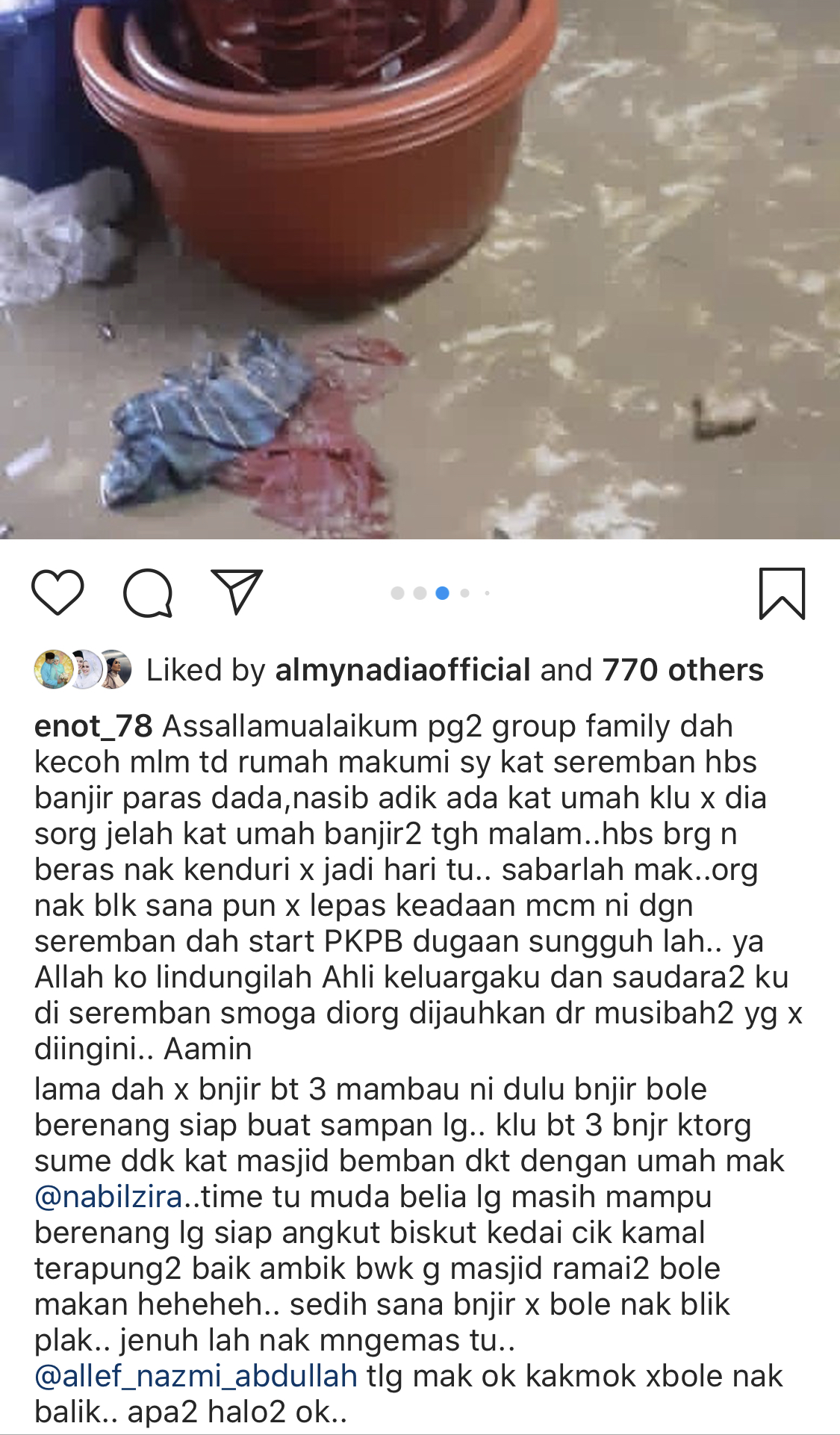 “Sedih sana banjir tak boleh nak balik pulak. Jenuh lah nak mngemas tu. @allef_nazmi_abdullah tolong mak ok Kakmok tak boleh nak balik. Apa-apa hello-hello okay,” kongsinya lagi.
